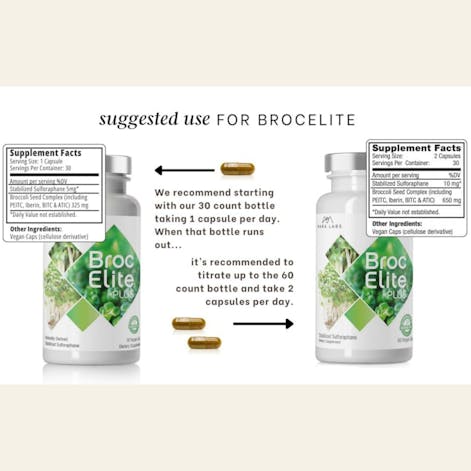 Stable sulforaphane (the main ingredient in BrocElite) is very potent and many people feel better taking just one capsule for the first month or so. We suggesting starting off with one capsule per day and gradually increasing to two capsules per day.