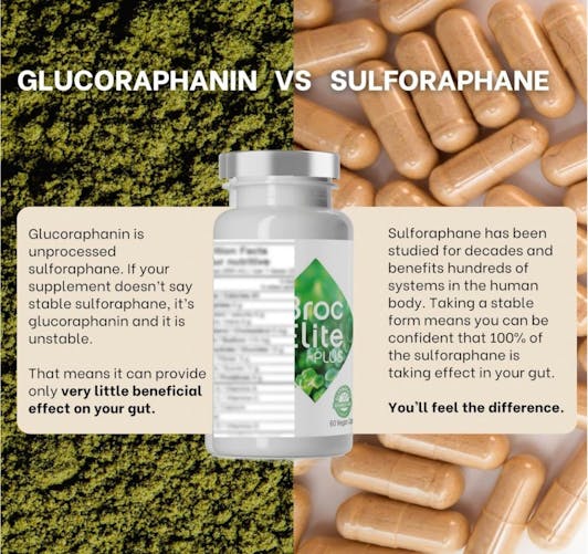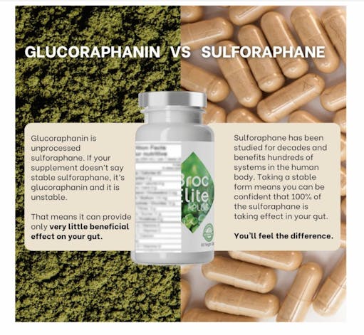 Broq’s sulforpahane comes from glucoraphanin that the body converts into sulforaphane -- if your gut has the right microbiome.BrocElite gives you actual, stabilized sulforaphane, and more.